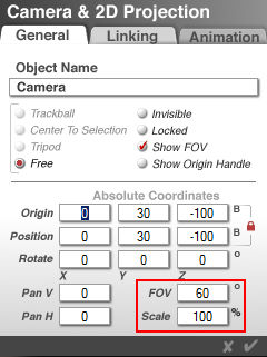 — Bryce Tips: Camera — Field of View (FOV) and Scale The terms FOV and Scale are a bit confusing. Perhaps we would rather know the focal length. Even though the «lens» is circular like a real one, the rendered picture is rectangular like a photograph on a film. In this respect, the Bryce camera is like a real camera. The Field Of View (FOV) always relates to the diagonal of a rectangle with the aspect ratio of 4:3. The horizontal angle of view never changes no matter how the the document aspect ratio is set — the aspect ratio simply prunes or expands the height. The picture shows the diagonal field of view (or rather angle of view) for different aspect ratios at FOV 60° and Scale 100%. If Scale is reduced, the field of view opens, it gets wider (wide angle lens); if it is enlarged, FOV closes, gets narrower (tele lens). Knowing the FOV in the diagonal is usually not what one likes to know but rather more interesting is the horizontal angle or field of view FOV. This can be calculated with a bit of trigonometry, though it is simpler to use just the calculator. Calculator for FOV and Scale for the Desired Horizontal Field of View Simply enter the desired horizontal angle of view into the form field. The value for Scale will be calculated, and additionally the equivqalent focal length of the camera for those interested in real camera lenses. Conventional Bryce Camera Bryce Camera — Used formulae for Scale: Used formulae for equivalent focal length and horizontal angle of view: Used formula for Scale value to keep diagonal FOV at any document aspect ratio: Note: Fisheye-Lenses — Used formulae for FOV andScale:
